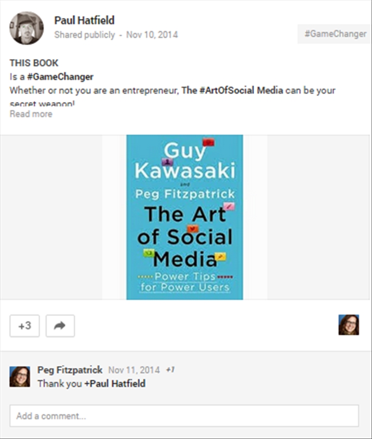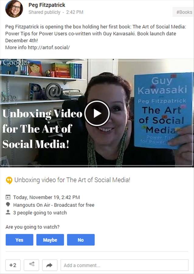 Smart... Peg made a Hangout on Air (HOA) video when she received copies of her book by mail from the Penguin I guess. A great personal touch since it was her first book. I know the feeling and it feels so great to see your name on the book cover. Most important it`s great to share your knowledge with others. I remember I got 50 free copies from my publisher for my first book.