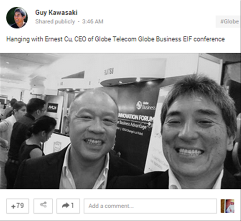 While Peg is promoting and siphoning every avenue of free publicity, Guy is hobnobbing with the CEOs of the world and taking selfies to promote his image on all the social media platforms and hopefully his new social media eBook. Hey Guy build that mailing list ;-).